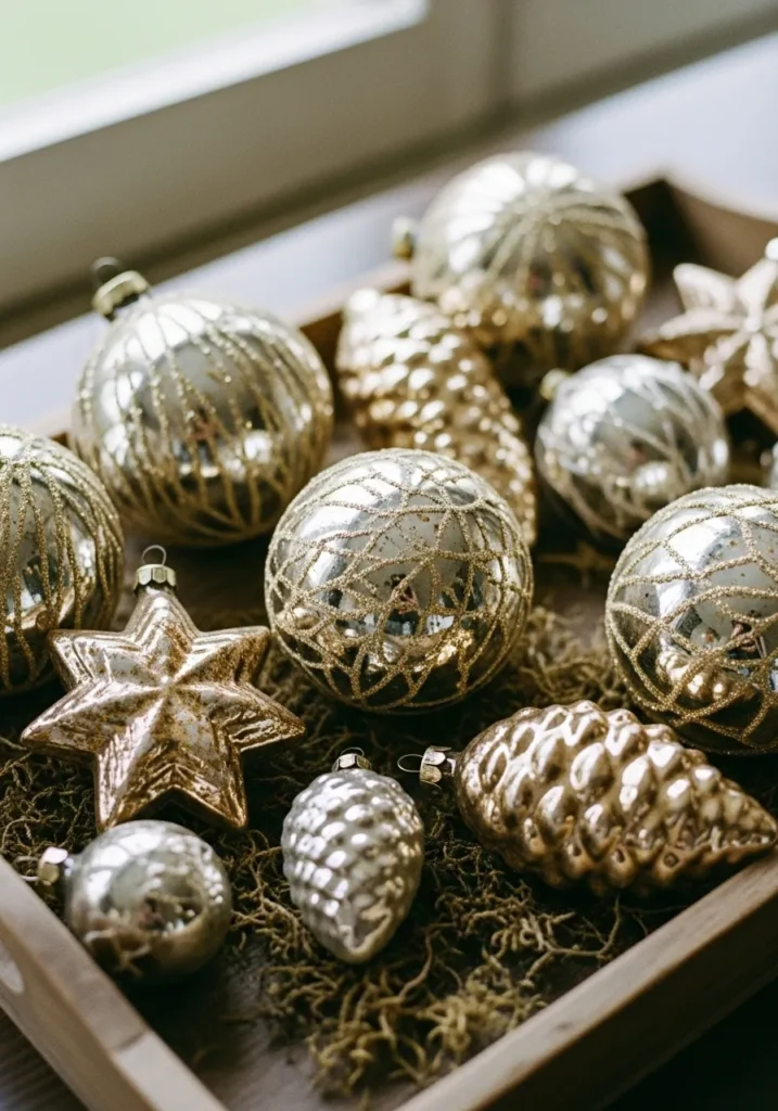 I love how this feels both elegant and personal. It’s such a simple idea—just a tray, a few ornaments, and some moss—but it creates the most charming display. It’s proof that a touch of gold can make even the smallest corner feel special.