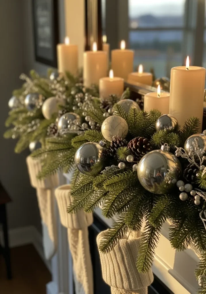 This scene glows with pure holiday magic. The mantel is dressed in evergreen garlands, silver ornaments, and glittering snowflakes, all lit by flickering candles that cast the softest golden light. The mix of textures—metallic shine, natural pine, and cozy candlelight—feels timeless and elegant.