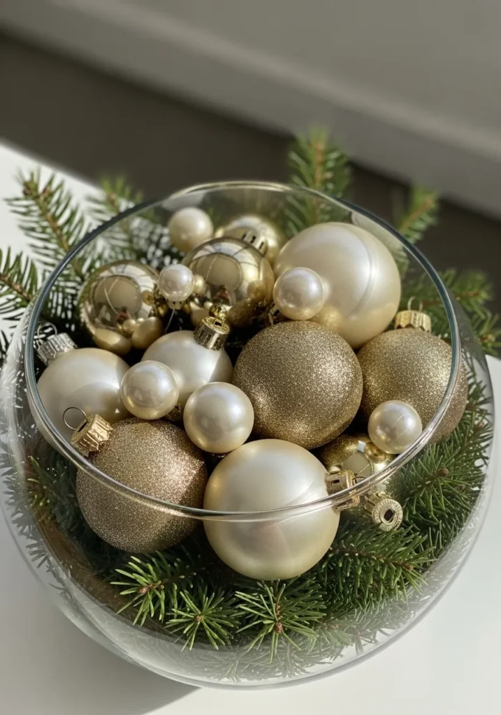 This glass bowl filled with champagne and pearl-toned ornaments feels like a little treasure chest of holiday beauty. The soft sparkle of matte, glossy, and glitter finishes creates depth, while the evergreen base adds a fresh touch of nature. It’s simple, elegant, and incredibly chic.