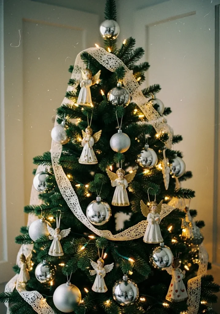 This Christmas tree brings heavenly charm to the season with its delicate angel ornaments and soft lace ribbon winding through the branches. The silver and white ornaments reflect the warm lights beautifully, giving the whole tree a gentle, celestial glow.