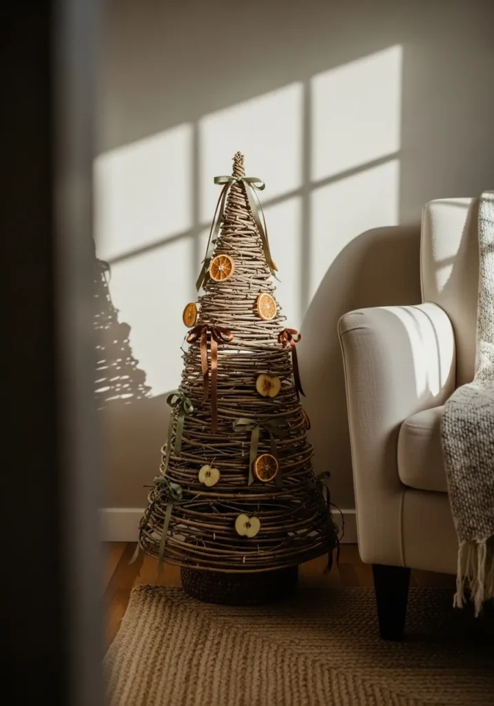 This cozy little corner features the sweetest handmade Christmas tree crafted entirely from woven twigs. Instead of glitter and tinsel, it’s decorated with dried orange slices, apple rounds, and a few satin ribbons in earthy tones. The sunlight catches the natural texture of the branches, casting beautiful shadows on the wall. It feels organic, warm, and just right for anyone who loves a minimalist, nature-inspired holiday look.