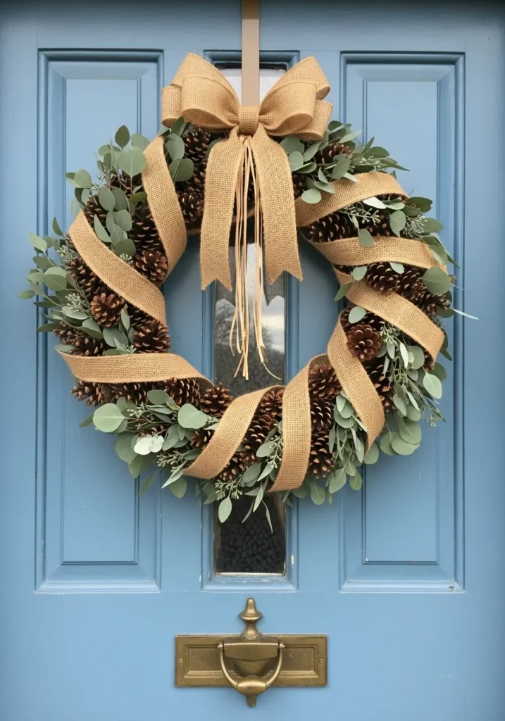 This handmade wreath is all about rustic charm meeting effortless elegance. Made with pinecones, sprigs of eucalyptus, and wrapped in a wide burlap ribbon that ties into a generous bow, it gives that perfect woodland-meets-farmhouse feel. The soft greenery peeking through the earthy tones of the cones looks stunning against the pastel blue door, while the touch of gold hardware underneath adds a hint of classic warmth. It’s simple, cozy, and feels like the kind of décor that makes guests smile before they even step inside.