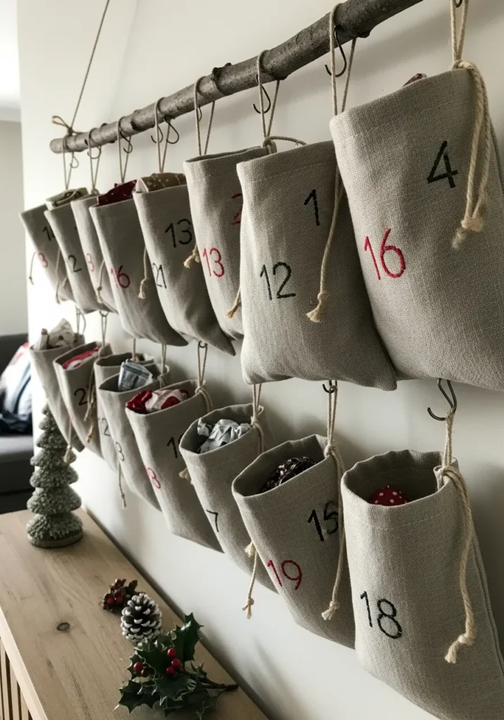 This rustic advent calendar design turns simple materials into something heartwarming and magical. A natural wooden branch serves as the base, with numbered linen pouches hanging neatly by twine, each one ready to hold a small surprise. The neutral tones of the fabric balance perfectly with the touch of red and black embroidery, giving it a cozy, handmade charm. The whole setup feels warm and natural, blending perfectly into any Scandinavian or farmhouse-style interior.