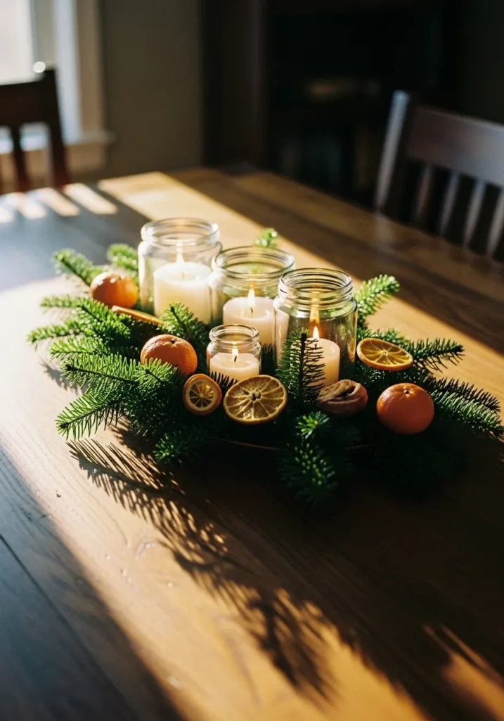 I absolutely adore this kind of setup because it feels so personal and grounded. There’s something special about mixing textures like glass, greenery, and citrus—it’s festive but not flashy. I love how the light dances across the jars, making the whole room feel soft and inviting. Honestly, if I could bottle up that gentle glow and cozy scent, I totally would.