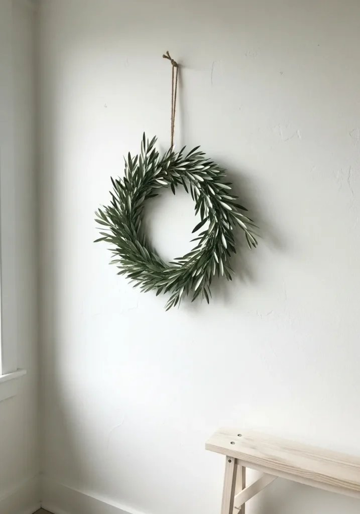 This simple olive leaf wreath is the definition of quiet beauty. Its design features soft green leaves with a slightly silvery sheen, arranged in a loose, airy circle that feels both natural and refined. The wreath hangs from a piece of rustic twine against a crisp white wall, creating a calm, Scandinavian-inspired look that feels fresh and effortlessly elegant. It’s the kind of decor that whispers Christmas rather than shouts it, perfect for anyone who loves understated charm.