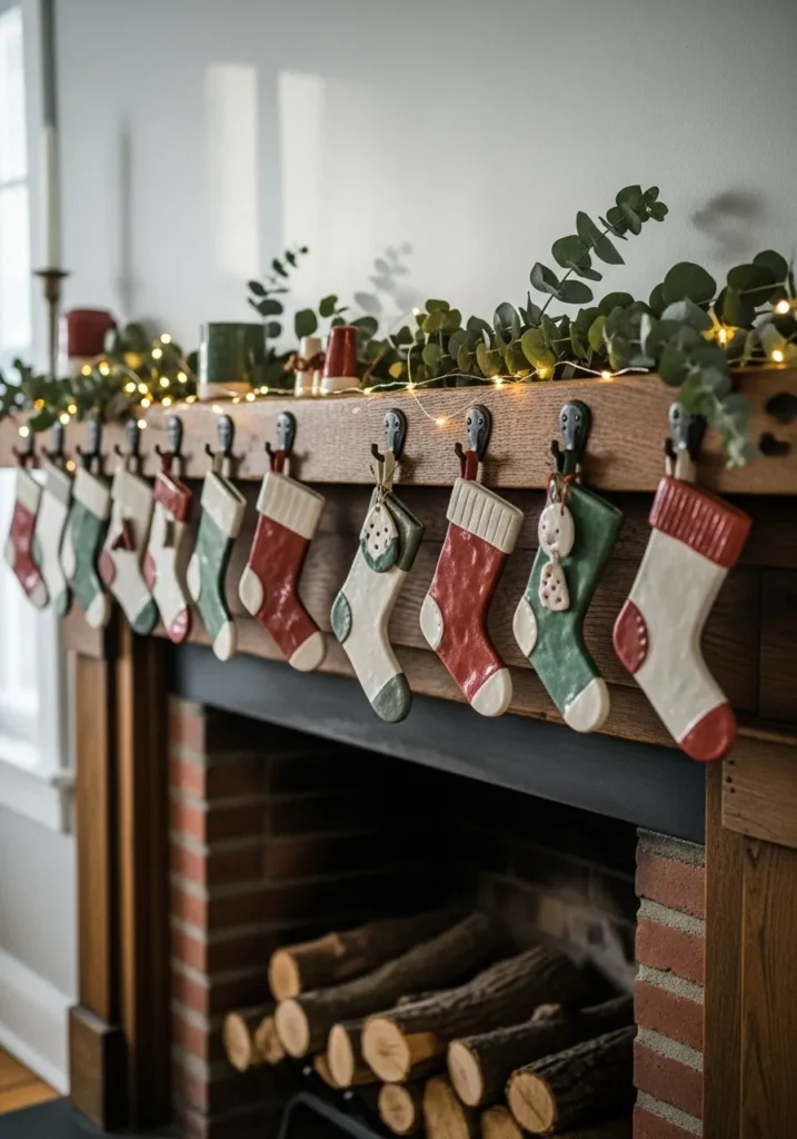 This cozy living room mantel feels like a scene straight out of a timeless Christmas movie. The wooden shelf is lined with handcrafted ceramic stockings in cheerful red, cream, and sage green, each one slightly unique and full of charm. A soft strand of fairy lights weaves through sprigs of fresh eucalyptus, giving off that perfect twinkle against the rustic brick fireplace and natural wood tones. The stacked firewood below adds just the right touch of warmth and authenticity that makes this space feel ready for hot cocoa and quiet evenings by the fire.