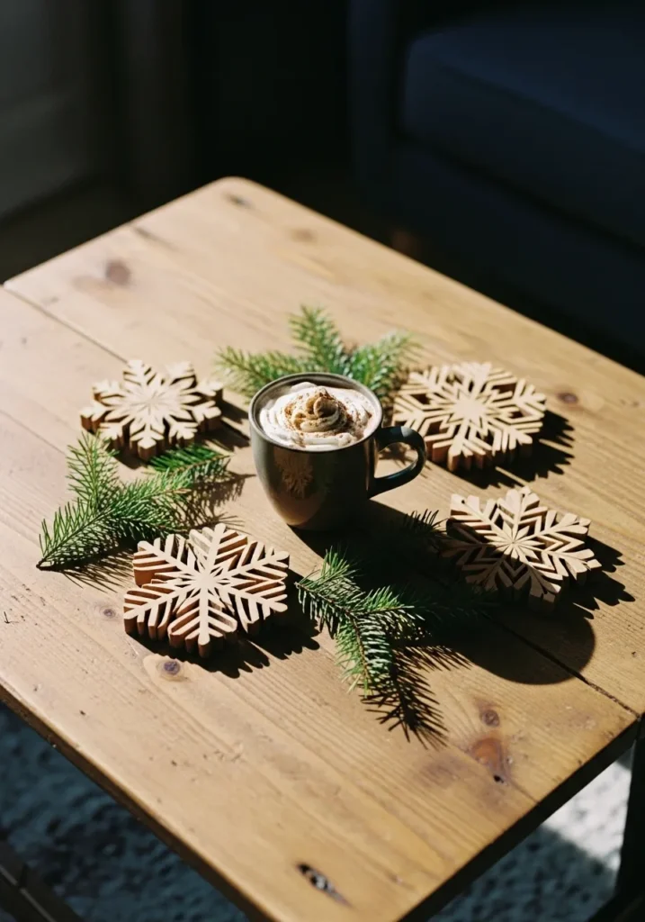 This cozy tabletop scene feels like the heart of handmade Christmas charm. A rustic wooden table sets the tone, its natural grain adding warmth and texture. Wooden snowflake coasters rest beneath a steaming cup of hot cocoa topped with a swirl of whipped cream and a dusting of cinnamon. Sprigs of evergreen frame the setup, bringing a subtle forest scent and a lovely pop of green. The soft morning light makes everything glow just a little, like a quiet December morning before the festivities begin.