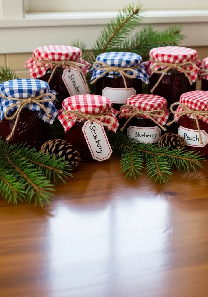 This adorable setup features rows of homemade jam jars dressed in red and blue gingham fabric, tied neatly with rustic twine bows. Each jar carries a simple handwritten label showing flavors like strawberry, blueberry, and peach, sitting gracefully among pine branches and tiny cones. The soft light reflecting off the polished wooden surface gives the whole scene a warm, cozy glow that feels straight out of a countryside Christmas kitchen.