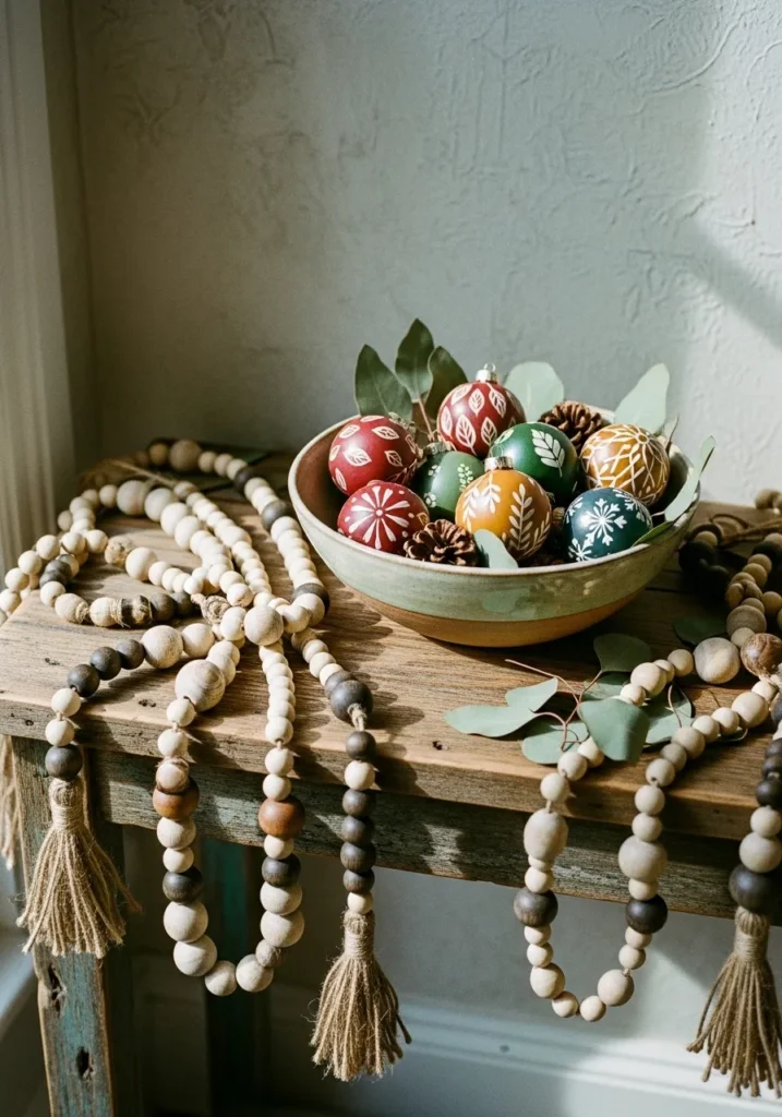 This cozy little setup feels like something straight out of a handmade Christmas dream. A rustic wooden table holds a ceramic bowl filled with hand-painted ornaments in earthy reds, greens, and mustard tones, each one delicately patterned with white leaves and snowflake motifs. Around the bowl, strands of wooden beads with soft tassels spill casually across the table, while a few sprigs of eucalyptus add that subtle touch of natural freshness. It’s the kind of display that feels perfectly imperfect—simple, warm, and so full of heart.