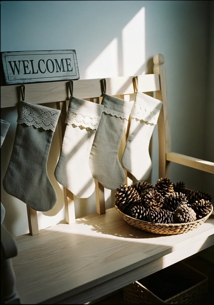 This entryway setup is pure understated charm. A simple wooden bench becomes the heart of the decor, with soft neutral stockings neatly hung along the backrest. Each one is trimmed with delicate lace, adding just the right touch of handmade sweetness. The woven basket filled with pinecones brings texture and warmth, while the small “Welcome” sign perched above ties it all together with a friendly, homey feel. The sunlight streaming across the natural wood adds that soft, golden glow that makes everything feel calm and cozy.