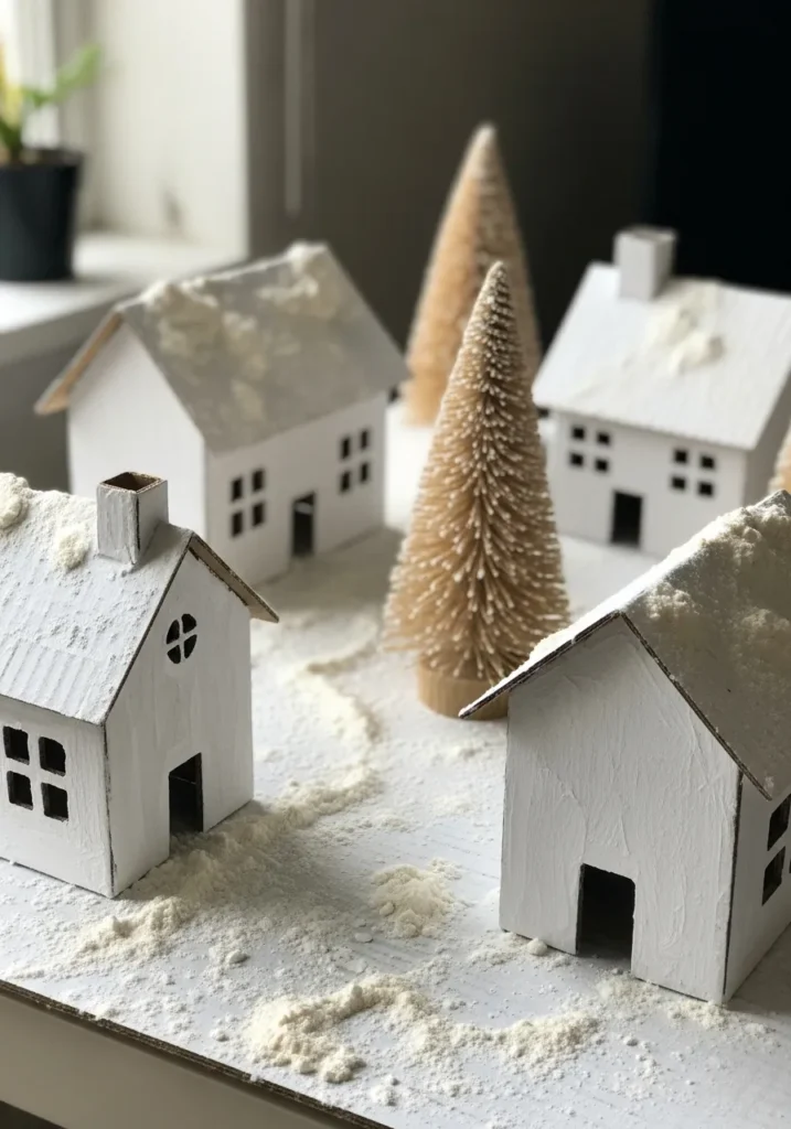 This adorable handmade Christmas village looks like it’s been plucked straight from a storybook winter scene. Tiny white cardboard houses dusted with faux snow sit beside soft bottle-brush trees, creating the sweetest little snowy neighborhood. The simple white palette keeps things calm and elegant, while the soft textures and imperfect details make it feel warm and handmade. It’s the kind of setup that looks just as lovely on a windowsill as it does on a mantel.