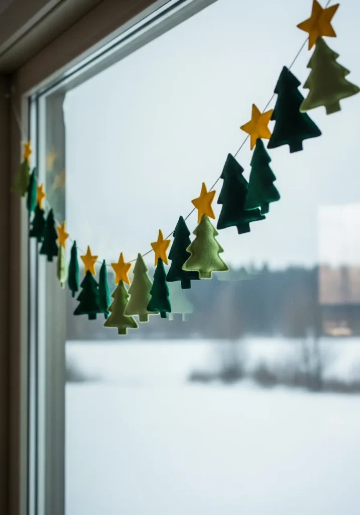 This handmade garland is the kind of simple craft that makes a home feel instantly festive. Tiny felt Christmas trees in soft shades of green hang alongside cheerful yellow stars, all strung neatly across a bright window. The snowy landscape outside makes the colors pop even more, giving that cozy “hot cocoa and soft socks” kind of mood we all crave in December. The felt texture adds such a warm, handmade charm that no store-bought decoration could ever quite match.