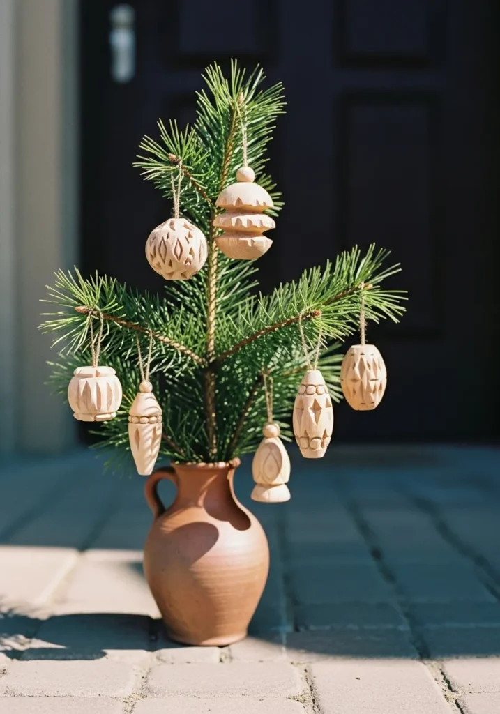 This charming little pine tree captures the heart of handmade Christmas magic in the most natural way. Set in a simple clay jug, the petite evergreen branch is dressed with hand-carved wooden ornaments, each one shaped and textured just enough to catch the light. The neutral wood tones keep everything warm and organic, while the uneven pine needles give that perfectly imperfect look we all secretly love during the holidays.