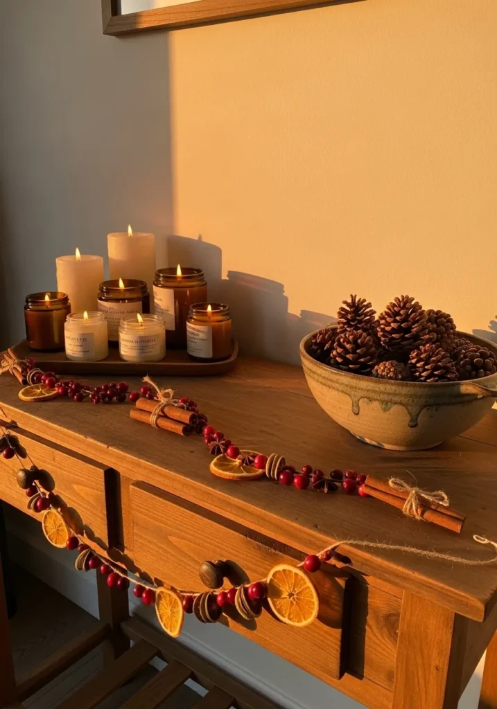 This cozy setup feels like a warm hug on a chilly winter afternoon. A rustic wooden console is decorated with the soft flicker of candles in creamy and amber jars, filling the room with that golden-hour glow. A simple handmade garland made of dried orange slices, cranberries, cinnamon sticks, and wooden beads drapes across the edge, adding that perfectly imperfect handmade charm. A ceramic bowl brimming with pinecones finishes the look, tying everything together with a touch of nature.