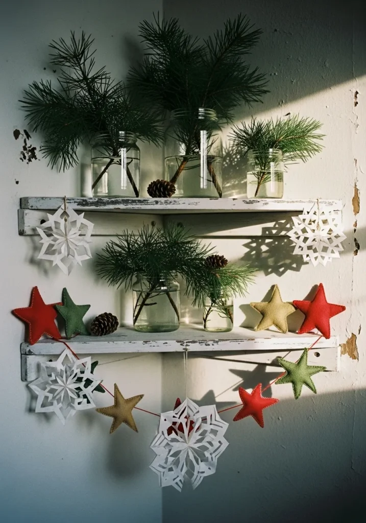 This little corner shelf brings together the loveliest bits of nature and handmade charm. Clear glass jars filled with fresh pine branches and tiny pinecones create that crisp forest feel, while the whitewashed wood shelves add a rustic, lived-in texture. A garland of soft felt stars in red, green, and gold mixes beautifully with delicate paper snowflakes, catching the sunlight in the sweetest way. Everything about this setup feels warm, calm, and effortless—like Christmas morning captured in one perfect nook.