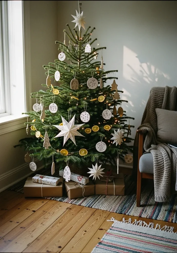 This simple yet heartwarming Christmas setup features a small evergreen tree dressed in handmade ornaments that feel wonderfully personal. The decorations include paper stars, dried orange slices, and clay ornaments hand-etched with charming little designs. Soft string lights weave through the branches, adding a golden glow that bounces off the natural green. Wrapped gifts in kraft paper rest neatly on a striped rug, and a cozy knit throw on the armchair completes the inviting nook by the window.