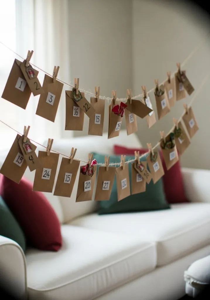 This cozy setup features a handmade advent calendar crafted from simple brown paper envelopes clipped to twine with tiny wooden clothespins. Each envelope is numbered and strung across a bright living room, adding a whimsical touch to the neutral space. The mix of kraft paper, soft natural light, and pops of festive red and green pillows on the couch make this design feel warm, organic, and effortlessly inviting. It’s a lovely balance between minimalism and nostalgia, creating a space that feels both stylish and heartfelt.