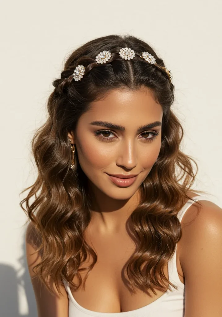 Soft waves fall gently around the shoulders while a loose braid wraps across the crown, decorated with dainty flower-shaped clips that shimmer in the light. The style feels romantic and slightly bohemian, perfect for a festive evening.
