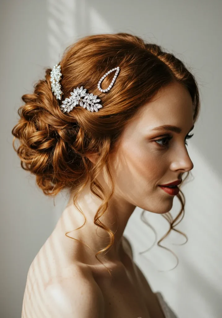 This dreamy updo is all about soft romance and a touch of sparkle. The rich copper-red hair is swept back into a loose low bun, with tendrils framing the face just right. The textured twists give it that effortless charm, while crystal hair clips add a festive shimmer that catches the light beautifully.