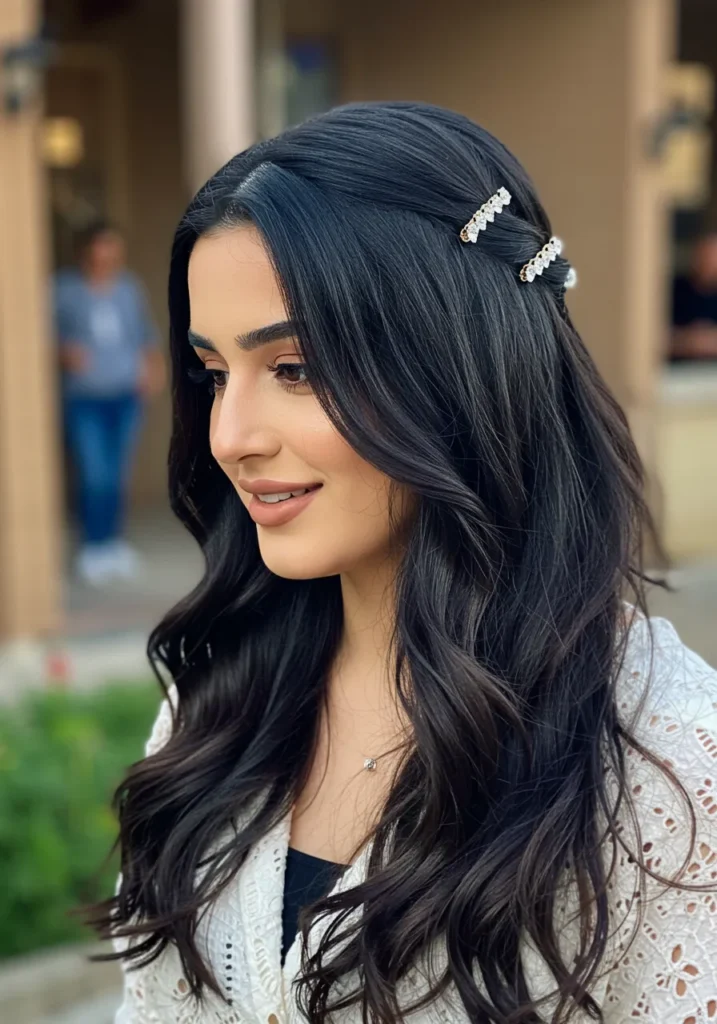 Long, dark hair never looked so sleek. These soft, cascading waves fall gracefully over the shoulders, giving major goddess energy. The deep black shade adds drama, while twin pearl barrettes tucked to the side add that subtle hint of holiday glam.