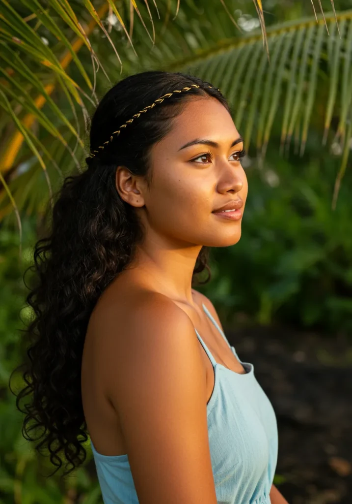 Defined curls, tropical glow, and a golden twist—literally. This natural curly style features a half-up look with a slim gold rope headband adding the perfect touch of sparkle. It’s light, breathable, and lets every curl do its thing while still feeling festive and put-together.