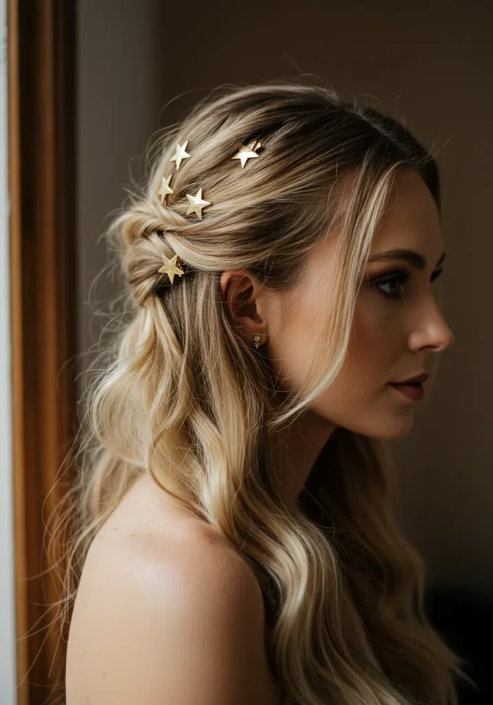 Golden stars in your hair? Yes, please. This style blends beachy loose waves with a soft twisted half-up detail, secured by tiny gold star clips that look straight out of a fairy tale. The blonde tones shimmer beautifully, catching every glimmer of holiday light.