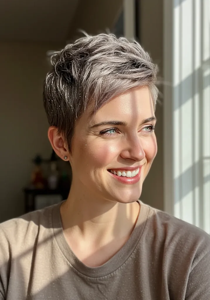 This short pixie cut has tons of texture and a soft silvery tone that shines under natural light. A hint of fine glitter dust catches the light across the layers, creating a subtle shimmer effect that feels playful yet elegant.