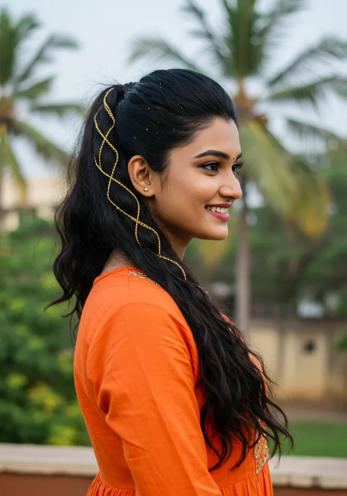 I’m obsessed with how this hairstyle feels equal parts traditional and trendy. The gold thread adds a creative twist that feels perfect for the season. It’s the kind of look that makes you want to toss your hair just to see it sparkle.