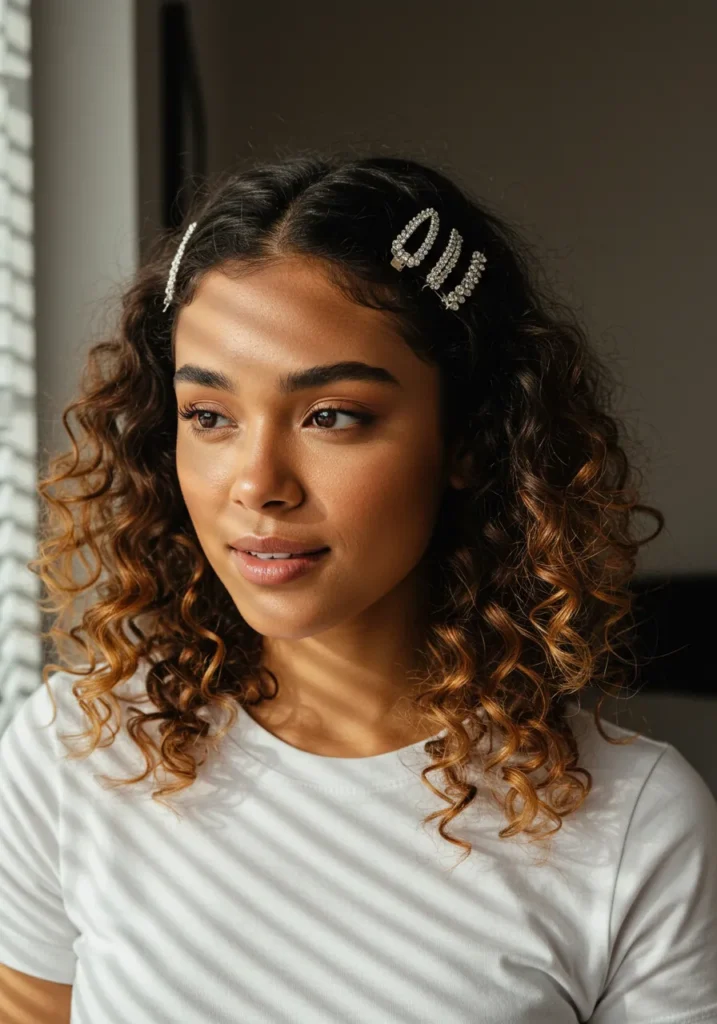 This hairstyle features soft, bouncy curls that fall just above the shoulders, full of shine and shape. The dark brown tone transitions into lighter caramel ends, adding natural warmth. Three sleek golden clips hold the curls neatly on one side, giving a polished, elegant touch that feels festive without being too formal.