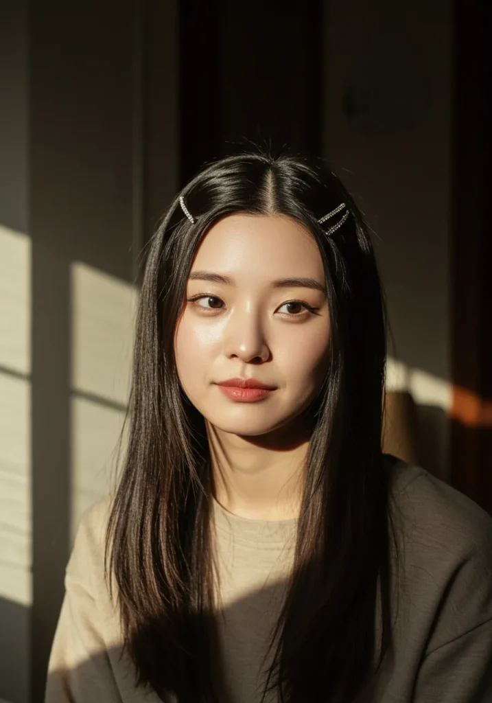 This look is all about sleek perfection. The hair is long, smooth, and glossy, parted neatly down the middle. Two delicate crystal barrettes on either side catch the light, creating just enough sparkle to elevate the style while keeping it minimal and elegant.