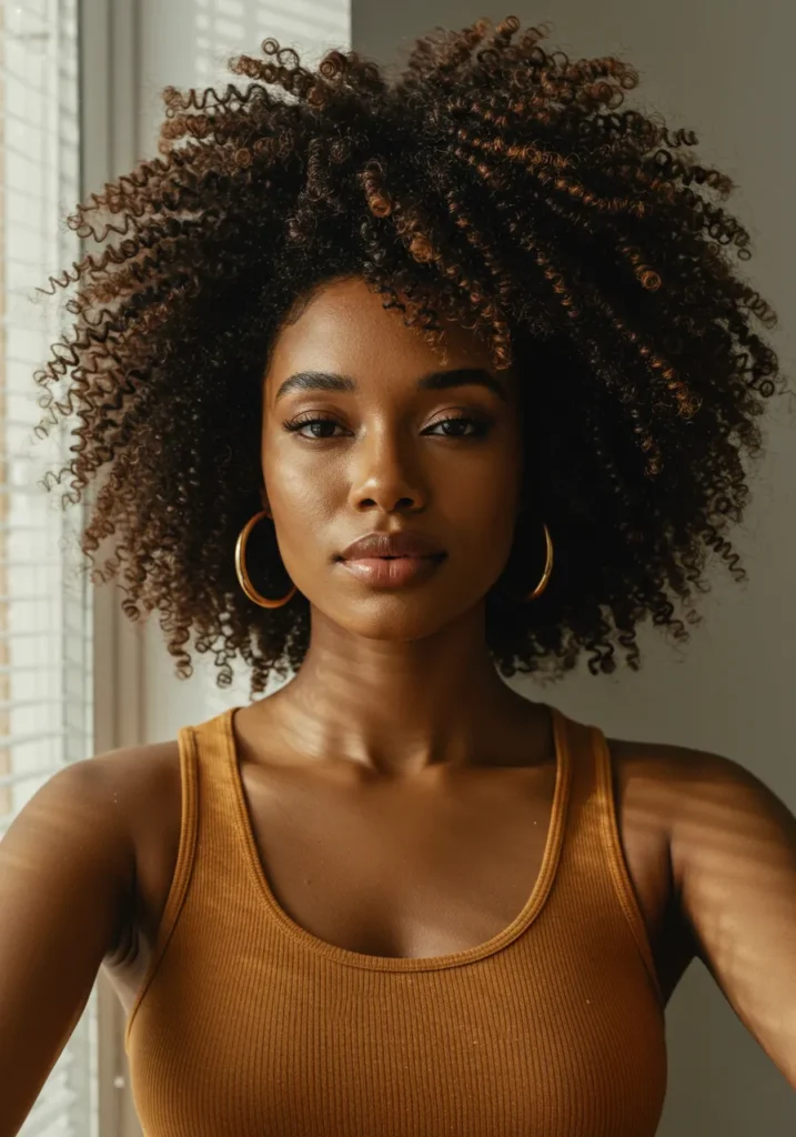 Here the natural curls are full, fluffy, and bursting with life. The shape frames the face beautifully, and soft light enhances the warm brown tones. A hint of shimmer catches between the curls, giving it a subtle festive glow that feels confident and powerful.