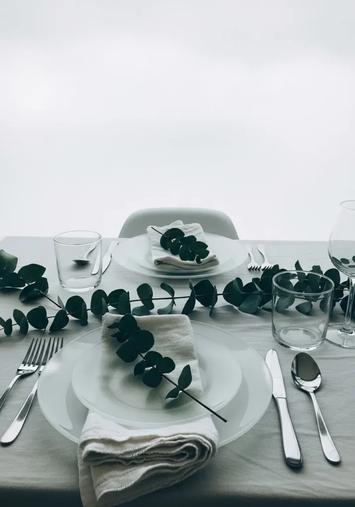 Here’s a table setting that proves less can truly be more. Crisp white plates, clear glassware, and simple silver flatware are arranged with precision, while sprigs of eucalyptus add that soft, organic touch. The whole table feels like a breath of fresh air—light, uncluttered, and naturally beautiful.