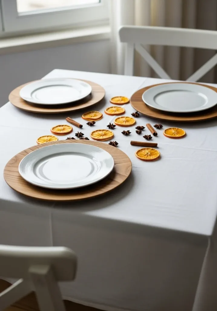 Fresh, bright, and full of personality, this table is a modern twist on traditional holiday decor. Dried orange slices, cinnamon sticks, and star anise scatter across a crisp white cloth, filling the space with natural color and warmth. The wooden chargers ground the look beautifully.