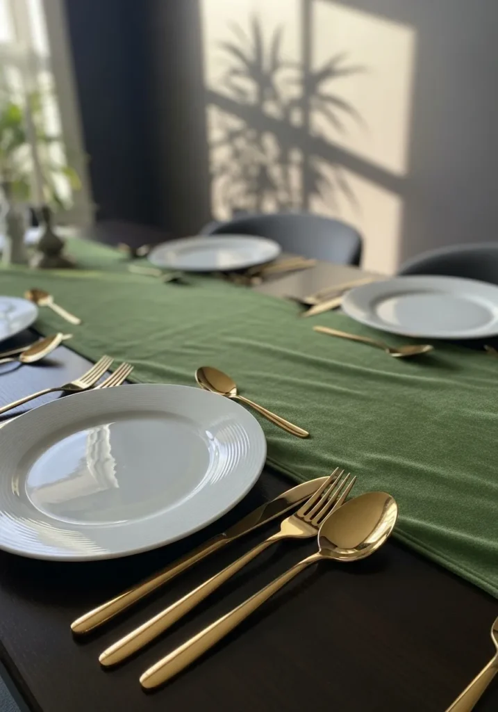 This setting is sleek, bold, and perfectly festive. The deep green runner contrasts beautifully with the gold flatware, while the white plates keep everything feeling crisp and fresh. It’s the kind of minimalist setup that still feels intentional and elevated.