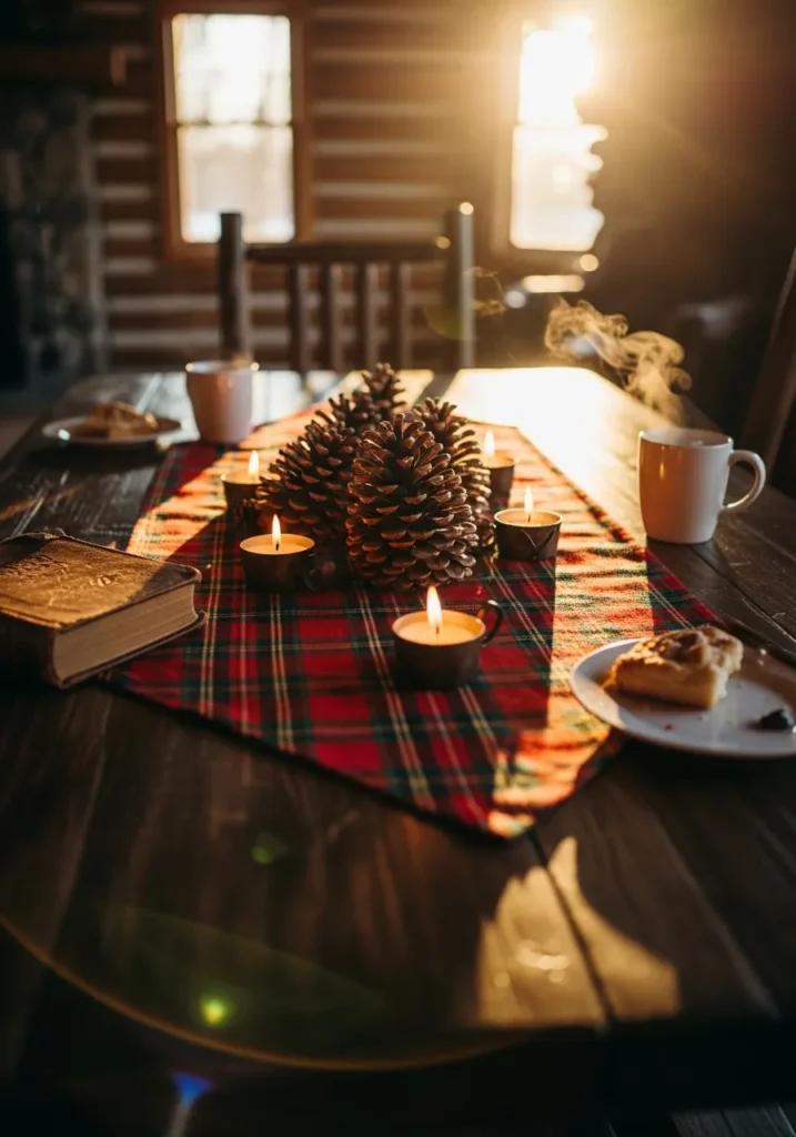 This table glows with rustic charm. A red tartan runner sets the stage for pinecones, candles, and the soft golden light of a cozy cabin interior. The steam rising from the mugs adds that extra touch of comfort that makes this scene feel almost magical.