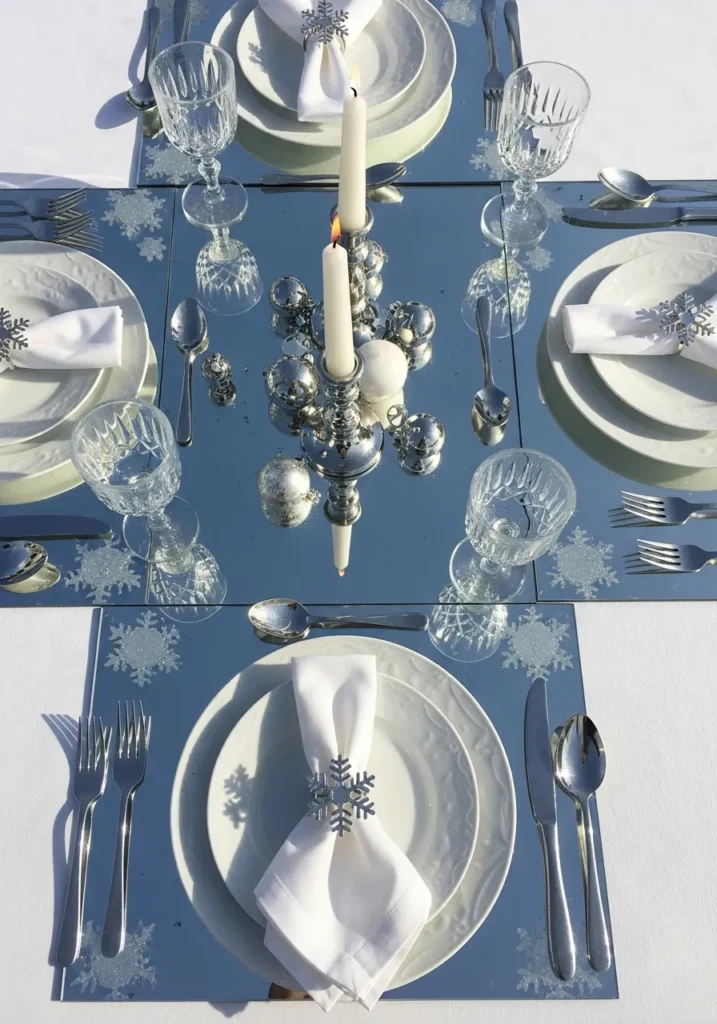 This table looks like it’s straight out of a winter wonderland. Reflective silver surfaces, crystal glassware, and white napkins adorned with delicate snowflakes create a sparkling, icy elegance. The mirrored base reflects the candlelight perfectly, making the whole setting shimmer like fresh snow.