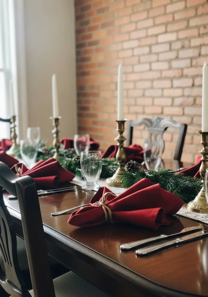 This table setting captures the timeless warmth of Christmas with deep red napkins tied in twine and classic brass candlesticks that glow beautifully against a brick wall backdrop. The greenery woven down the center adds just the right touch of nature, making the whole scene feel cozy and elegant.