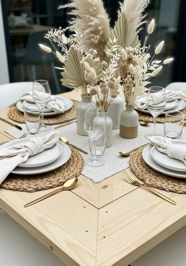 If you’re into cozy textures and natural tones, this table is such a dream. Soft linen napkins, woven placemats, and creamy ceramic vases filled with dried florals and pampas grass create a warm, organic look. The neutral color palette with hints of gold keeps things festive in the most effortless way.