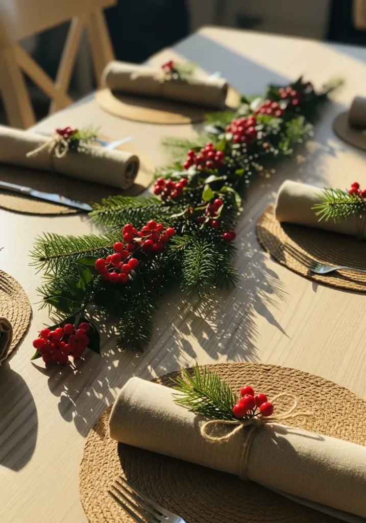 This table celebrates the beauty of nature with bright red berries, pine branches, and natural linen accents. Rolled napkins tied with twine and tiny sprigs of greenery add a handmade charm that feels timeless and sweet. The sunlight streaming across the wood makes everything glow beautifully.