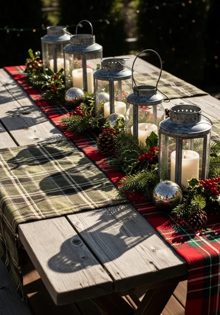 This rustic setup brings all the Christmas magic outdoors. A tartan table runner sets the foundation for a row of vintage lanterns surrounded by pinecones, holly, and evergreens. The soft candlelight flickering inside each lantern creates the most enchanting glow as the evening sets in.