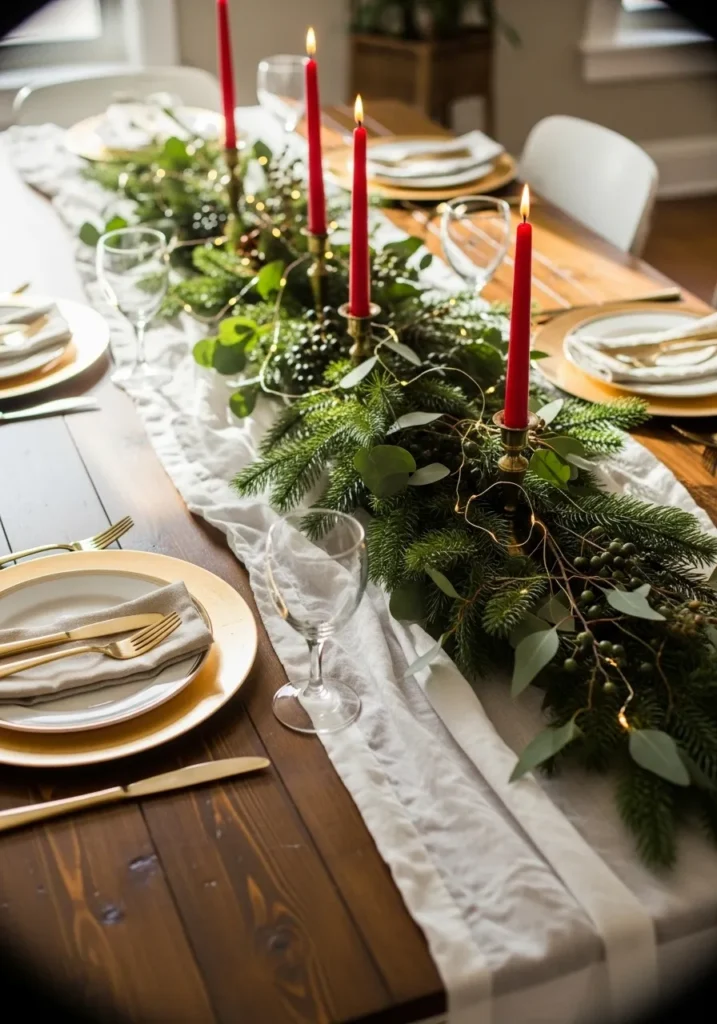 This table setting feels like a love letter to traditional Christmas style with a modern glow. Red taper candles rise gracefully from a lush bed of evergreens and eucalyptus, while gold flatware and chargers shimmer softly under the candlelight. The combination of rich greenery and golden accents gives the whole setup a warm, luxurious feel.