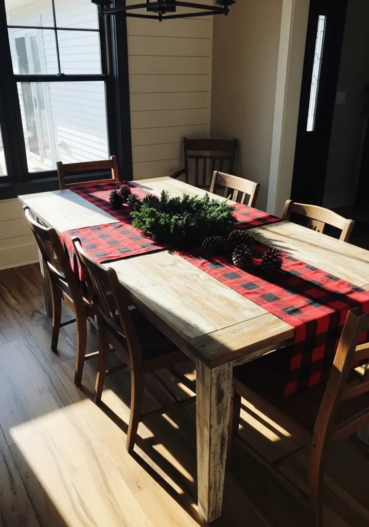 I adore how cozy and inviting this feels. It’s festive, homey, and perfect for a relaxed gathering with friends or family. There’s something so charming about the mix of plaid, greenery, and candlelight—it’s pure holiday comfort.