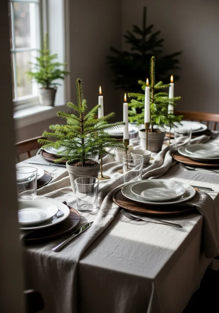 This table setting feels like a mini winter woodland right in your dining room. Tiny potted evergreens sit between slender candles, surrounded by soft linen and simple dinnerware. The mix of earthy textures and natural light makes it feel organic and welcoming.