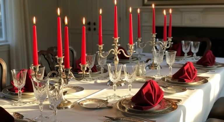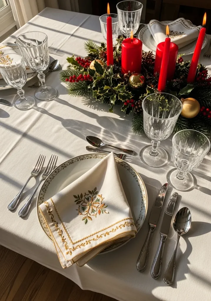 Classic Christmas never goes out of style, and this table proves it. Bright red candles surrounded by holly leaves, berries, and golden ornaments create the perfect centerpiece. Delicate embroidered napkins and vintage glassware add a nostalgic touch that feels both elegant and heartfelt.