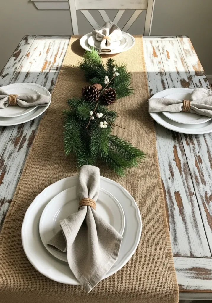 This table brings together all the beauty of natural textures with its burlap runner, pine sprigs, and simple white dinnerware. The soft beige napkins tied with twine feel wonderfully effortless, while the aged wooden table adds that cozy farmhouse touch.