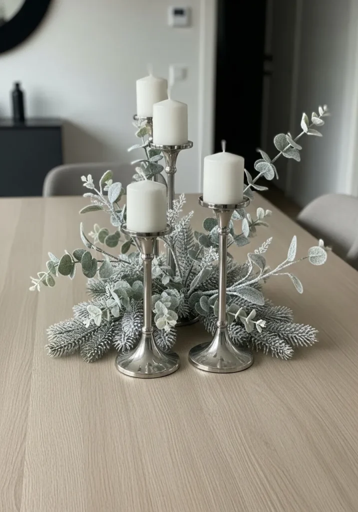 This table setting is the definition of modern winter charm. Sleek silver candle holders rise gracefully from a lush bed of frosted evergreens and eucalyptus, creating a look that’s both refined and festive. The soft matte finish of the candles pairs beautifully with the metallic shine, while the neutral wood table keeps everything feeling airy and natural.