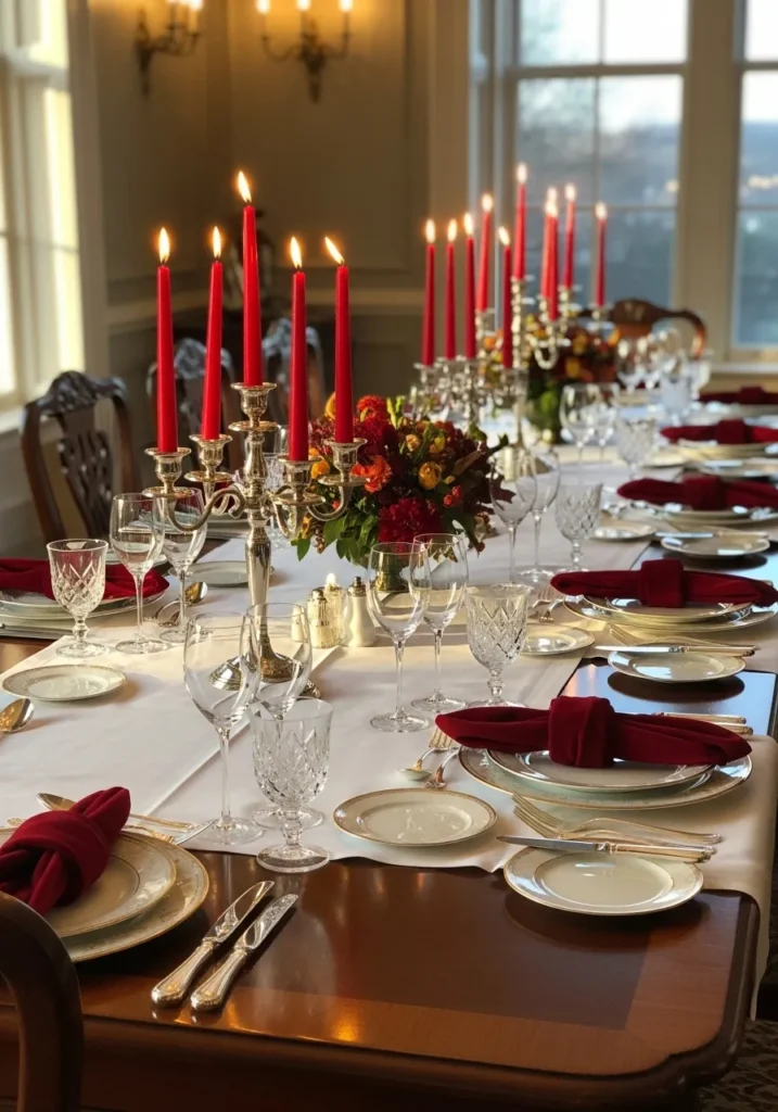This one is pure Christmas sophistication. A long table lined with tall red tapers and crystal glassware creates an atmosphere of old-world glamour. The deep red napkins and floral centerpieces add richness and warmth, while the gold-rimmed plates shimmer softly under the candlelight.