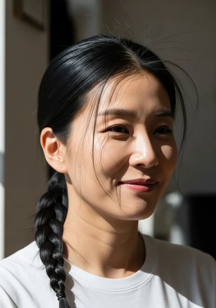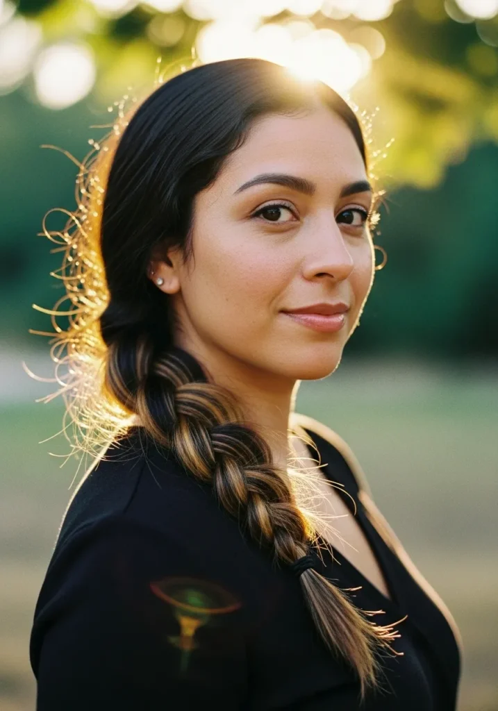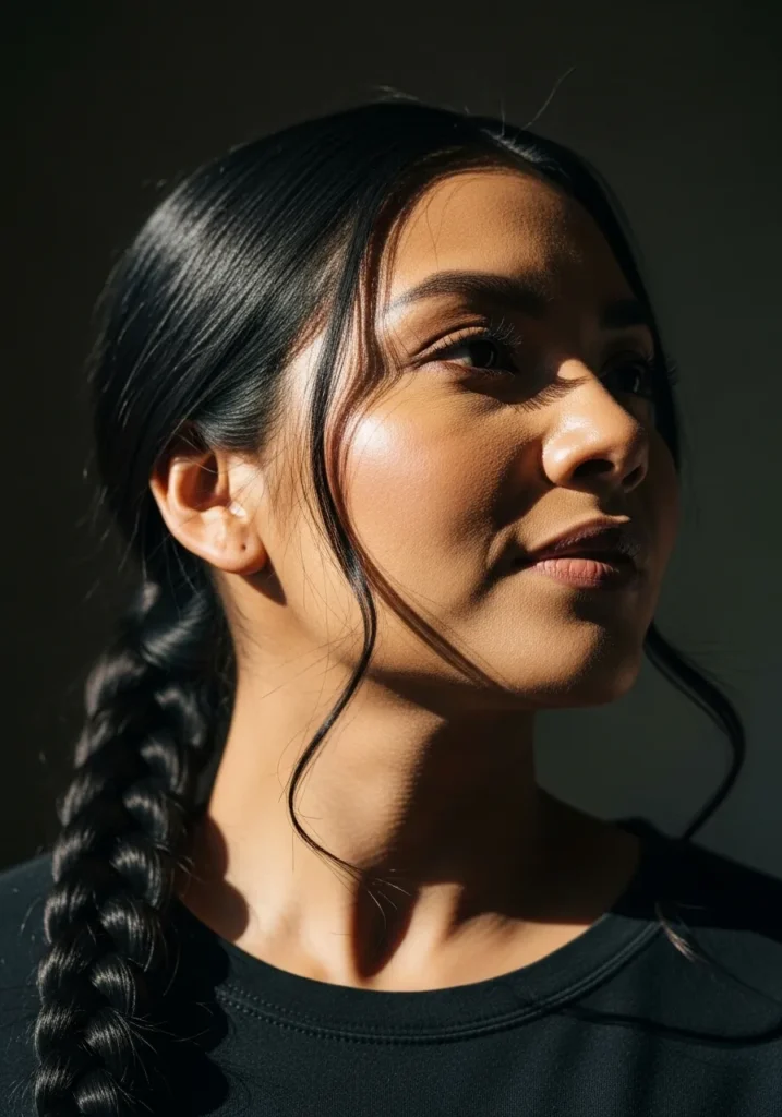 This look keeps things simple with a smooth, traditional braid that showcases glossy black hair and a clean middle part. A few soft flyaways give it that relaxed charm, while the shine from natural light adds an elegant finish.