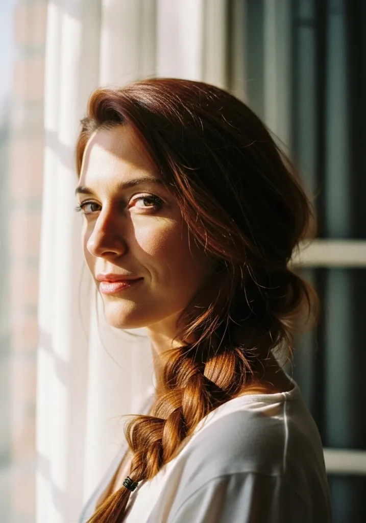 This braid drapes softly over one shoulder, with a few loose strands framing the face. The warm auburn hair has a natural shine that pops in daylight, giving off that perfectly imperfect look.