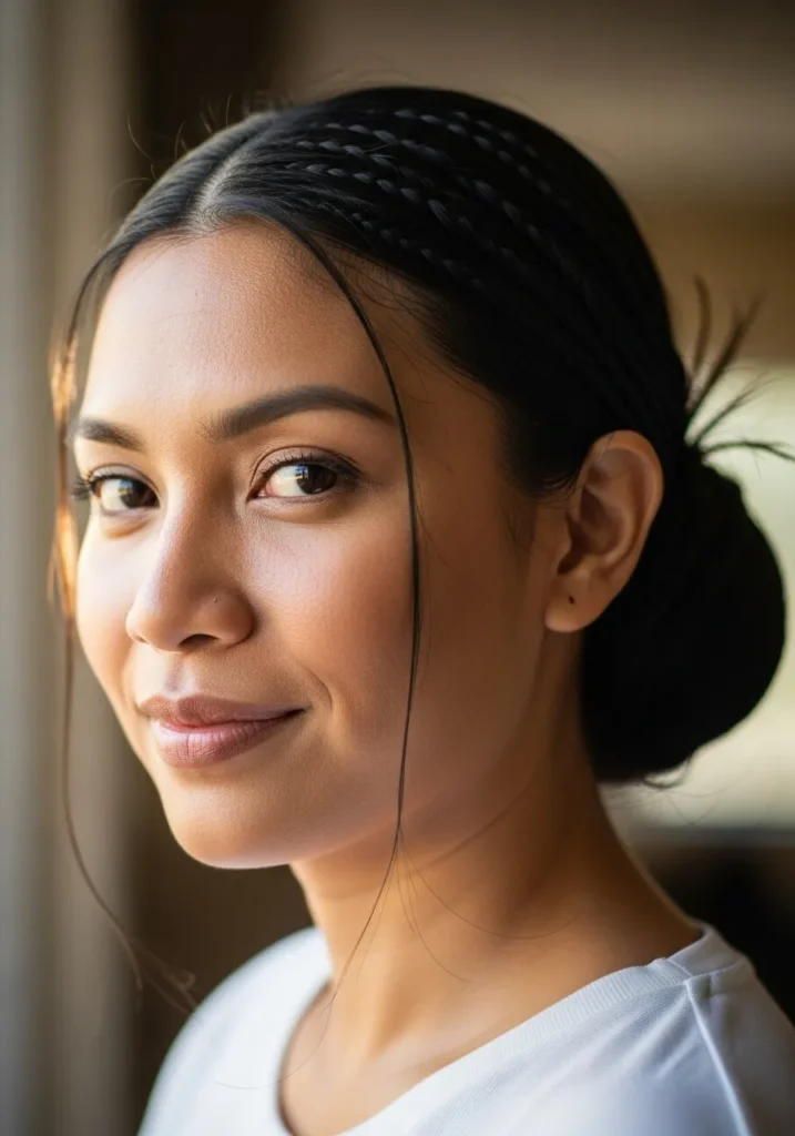 This elegant style combines thin braids along the crown with a low bun at the nape. The dark hair shines beautifully under soft light, and two loose pieces in front add just the right amount of softness.